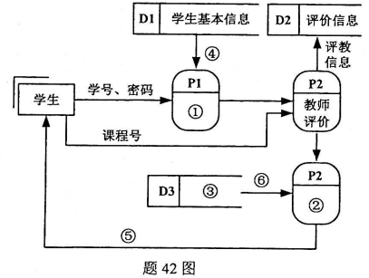 系统根据学生输入的学号和密码,利用学生基本信息进行身份验证。通过身份验证后,系统根据学生输入的课程号执行对任课教师评价的处理程序。系统确认学生提交对任课教师的评教信息后执行对应课程号的成绩查询功能。成绩查询处理根据课程号从学生成绩信息表中查询学生欲查的课程成绩,并将成绩提供给学生。上述业务处理的数据流程图如题42图所示。