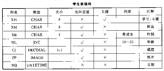 【正确答案】:CREATE TABLE STUDENT (XH CHAR(8)NOT NULL PRIMARY KEYDEFAULT’00000000’.XM CHAR(8)NULL,.XB CHAR(9)NULL.NL LNT NULL.CJ DECLMAI。(3,1)NULL,ZP IMAGE NULL,RQ DATETIMF NOT NULL.CHECK(NL>l5 AND NL<26).CHECK(XB IN(‘男’,‘女’)))