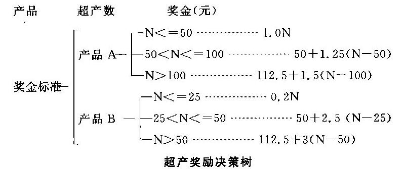 某工厂生产A和B两种产品,对工人超产奖励的标准是:对A产品生产者超产数(N)小于或等于50件时,每超产1年奖励1元;N大于50、并小于或等于:L00件时,大于50的部分每件奖励1.25元,其余每件奖励1元;N大于100件时,超过100的部分每件奖励1.5元,其余按照超产100件以内的方案处理.对于产品B的生产者,超产数N小于或等于25件者,每超产l件奖励2元,N大于25、并小于或等于50件时,超过25件的部分每件奖励2.5元,其余按超产25件以内处理;N大于50件者,超过50件的部分每件奖励3元,其余 按照产50件以内处理.试用决策树描述上述原则.