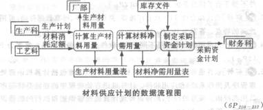 请绘制供应科编制材料供应计划的数据流程图,处理过程如下: (1)计算生产材料用量。供应科根据生产科提供的生产计划和工艺科提供的材料消耗定额,计算出各种产品的材料需要量,经分类、合并后,得到生产材料用量表,这个表除保存自用外,还要复制送厂部。 (2)计算材料净需用量。根据生产材料用量和库存文件中材料初始库存量、储备定额等数据得到材料净需用(采购)量表,并保存。 (3)制定采购资金计划。根据材料净需用量表中需要采购的各种材料数量,及库存文件中各种材料的价格计算采购所需资金,形成采购资金计划,并送财务科。