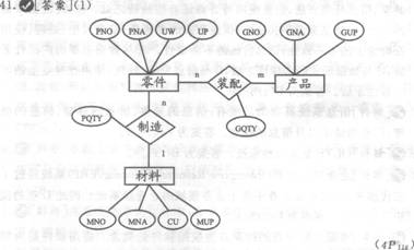 桌工厂生产多种产品,每种产品又要使用多种零件,一种零件可能装在多种产品上。每种零件由一种材料制造,每种材料可用于不同零件的制作。 作者:高老师 时间:2024-07-30 浏览 1 桌工厂生产多种产品,每种产品又要使用多种零件,一种零件可能装在多种产品上。每种零件由一种材料制造,每种材料可用于不同零件的制作。有关产品、零件、材料的数据字段如下:产品:产品号(GNo),产品名(GNA),产品单价(GuP’零件:零件号(PNo),零件名(PNA),单重(uw),单价(uP)材料:材料号(MNO),材料名(MNA),计量单位(cu),单价 (MUP)以上各产品需要各种零件数为GQTY,各零件需用的材料数为PQTY(1)请画出产品、零件、材料的E—R图。(4P118)(2)请将该E-R图转换为关系数据模型(下划线标识主码)。(4P120)【正确答案】: (2)E-R图转化为关系模型为: 产品(GN0,GNA,GUP)零件(PN0,PNA,UW,UP,MN0,PQTY)材料(MN0,MNA,CU,MUP)装配(PN0,GN0,GQTY)(4PⅢ) 📱 扫码体验刷题小程序 扫一扫使用我们的微信小程序