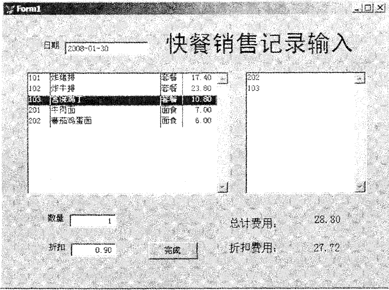 以上过程可以重复。一个顾客的食品全部输入完成后,单击“完成”按钮,清空右边的列表内容。试回答以下问题: