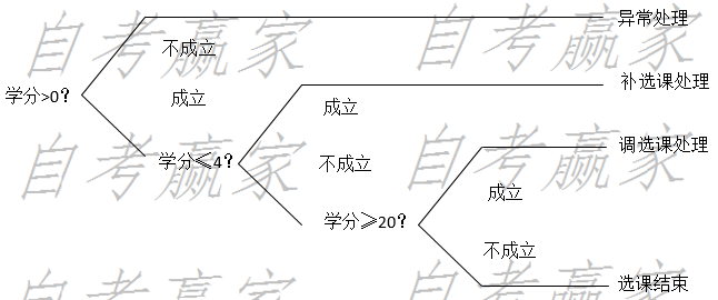 某学生选课系统根据学生本学期选课学分的不同,采取不同的处理:(1)学分总数小于等于0分,则进行“异常”处理:(2)学分总数大于0 作者:高老师 时间:2024-07-29 浏览 1 某学生选课系统根据学生本学期选课学分的不同,采取不同的处理:(1)学分总数小于等于0分,则进行“异常”处理:(2)学分总数大于0分,小于或等于4分,则直接进行“补选课”处理;(3)学分总数大于20分,则进行“调选课”处理;(4)其他情况为正常,选课结束。请用决策树表示该决策过程。【正确答案】:【评分参考】条件设立共6分,对应决策共4分。 📱 扫码体验刷题小程序 扫一扫使用我们的微信小程序