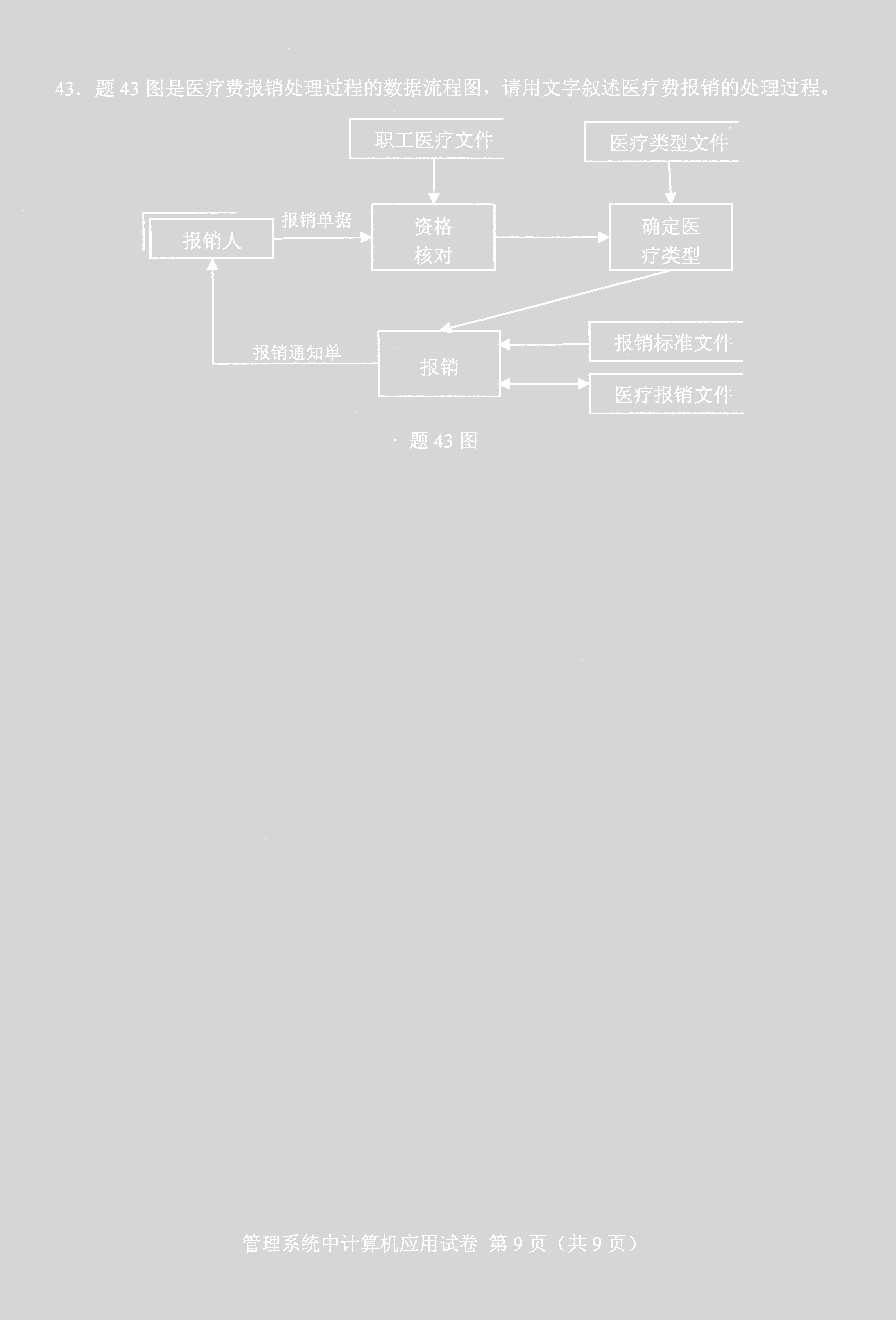 题43图是医疗费报销处理过程的数据流程图,请用文字叙述医疗费报销的处理过程。 作者:高老师 时间:2024-07-29 浏览 0 题43图是医疗费报销处理过程的数据流程图,请用文字叙述医疗费报销的处理过程。【正确答案】:(1)接收报销人交来的报销单据,首先通过职工医疗文件进行资格核对(2)查询医疗类型文件确定医疗类型(3)根据报销标准文件和医疗报销文件完成报销(4)修改医疗报销文件,将报销通知单发给报销人 📱 扫码体验刷题小程序 扫一扫使用我们的微信小程序