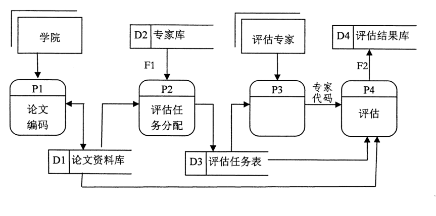 学院论文评估系统的数据流程图如题42图。首先对有待评估的论文编码,保存论文并分配给评估专家,评估专家需要先登录,然后进行论文评估,并保存评估结果。