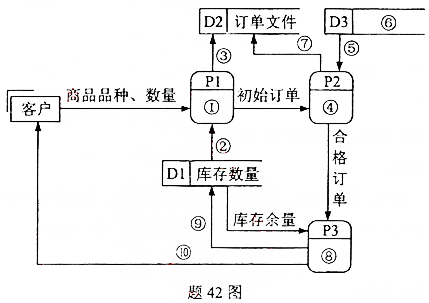 某电子商城订单处理的流程如下:系统根据客户订货的商品品种、数量以及该商品的库存余量生成初始订单,根据客户的信用数据审核初始订单,产生合格订单,然后执行订单,执行订单包括根据出库单核减库存和为客户提供发票。上述业务处理的数据流程图如题42图所示。
