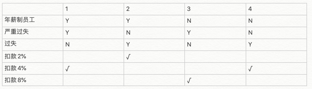 关于员工工作过失处罚规定如下:(1)年薪制员工:严重过失,扣当月薪资的4%; 过失,扣当月薪资的2%。(2)非年薪制员工:严重过 作者:高老师 时间:2024-07-29 浏览 0 关于员工工作过失处罚规定如下:(1)年薪制员工:严重过失,扣当月薪资的4%; 过失,扣当月薪资的2%。(2)非年薪制员工:严重过失,扣当月薪资的8%;过失,扣当月薪资的4%。根据以上规定,写出决策表。【正确答案】: 📱 扫码体验刷题小程序 扫一扫使用我们的微信小程序