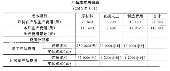 某企业采用定额比例法计算分配A产品的完工产品和月末在产品成本,2010年8月份有关生产费用见产品成本明细表,本月完工产品定额工时12000小时,月末在产品的定额工时为4200小时。[要求]根据以上资料完成下表。(原材料费用按定额费用比例分配,其他各项费用按定额工时比例分配,费用分配率计算结果保留到小数点后五位数,其他计算结果保留到小数点后两位数)