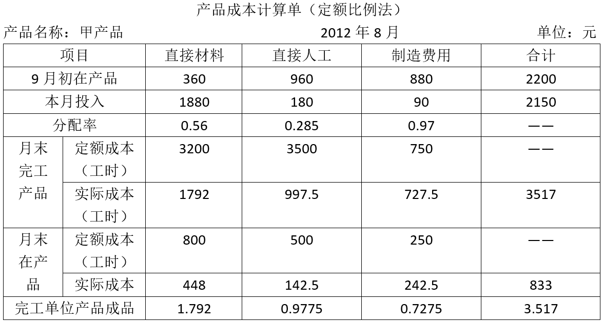 某企业2012年8月生产甲产品采用定额比例法分配费用,原材料按定额费用比例分配,其他费用按定额工时比例分配。月末完工甲产品1000件,月末实际结存在产品800件,甲产品8月初在产品和本月发生的实际费用,如下表:[图1]