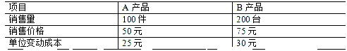 假定某公司生产和销售A.B两种产品,预计201×年全年固定成本总额为10,350元,两种产品可以实现产销平衡。有关两种产品销售量、售价、成本预算资料如下表: