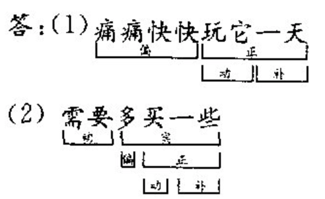 用直接组成成分分析法从大到小分析下列词组。(1)痛痛快快玩它一天(2)需要多买一些 作者:高老师 时间:2024-08-02 浏览 1 用直接组成成分分析法从大到小分析下列词组。(1)痛痛快快玩它一天(2)需要多买一些【正确答案】:(1)痛痛快快玩它一天 [ 偏 ][ 正 ] (动 )(补) (2)需要多买一些 [ 动][ 宾 ] (偏)( 正 ) (动)(补) 📱 扫码体验刷题小程序 扫一扫使用我们的微信小程序