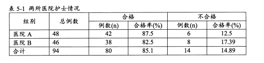 某研究者调查了两所医院护士操作考试情况,总结为如下统计表。请指出在统计表的结构与绘制方面存在的问题,并说明如何改正。