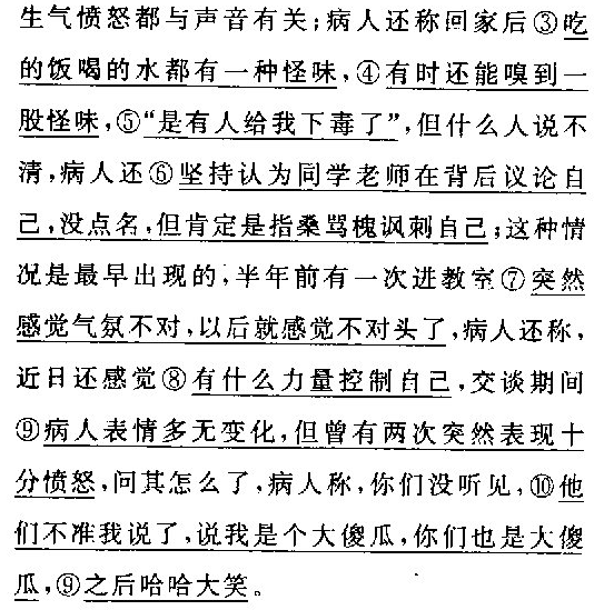 病例分析要求:(1)注明病历中的精神症状(请在“精神检查”中用域线的方法划出、编号,并 在答卷上按你的编号顺序逐条列出所划症状的名称); (2)说明疾病诊断; (3)写出该患者的 护理问题; (4)如何做好该患者的服药依从性管理?王某 男 19岁 大学一年级学生 现病史:患者发病半年,现休学在家。发病时无明显原因,先是夜里不睡.在宿舍楼道 里来回走动.时而比比划划,时而愤怒生气,上课注意力不集中,学习成绩明显下降,在宿舍 里还多次和同学发生冲突,认为同学合伙挤对他,2个月前干脆不去上课,回到家不吃家人 做的饭.自己做饭吃,买矿泉水喝,总说哪儿都不安全,想跑到五台山躲起来,因病情加重. 治疗护理不配合,由家人骗采住院治疗。家族史:(一)。个人史:拙子,现上大学一年级,从小一直比较顺利,学习成绩好.平素性格敏感,好面子,偶尔吸烟.喝啤酒,量不多,无其他特殊嗜好,未正式交女友,否认重大精神刺激。 既往史:(一)。否认药物过敏史。 入院躯体检查:未见异常。实验室常规检查:未见异常。 精神检查:神志清楚.衣着尚整,接触一般,定向力可,时医生的检查较警觉.病人对医 生反复强调,我精神没问题,你们得让我出去.否则有什么后果你们是要负责任的。经劝说 后,病人简单回答了医生的问题,病人称近半年来一到晚上耳边就能听到几个人的说话声, 男女都有,自己干什么就说对或不对,有时还骂自己,承认比比划划、生气愤怒都与声音有 关;病人还称回家后吃的饭喝的水都有一种怪味,有时还能嗅到一股怪味,“是有人给我下 毒了”,但什幺人说不清,病人还坚持认为同学老师在背后议论自己,没点名,但肯定是指桑 骂槐讽刺自己;这种情况是最旱出现的,半年前有一次进教室突然感觉气氛不对,以后就感 觉不对头了,病人还称.近日还感觉有什么力量控制自己,交谈期间病人表情多无变化,但 曾有两次突然表现十分愤怒,问其怎么了,病人称,你们没听见,他们不准我说了.说我是个大傻瓜,你们也是大傻瓜,之后哈哈大笑。