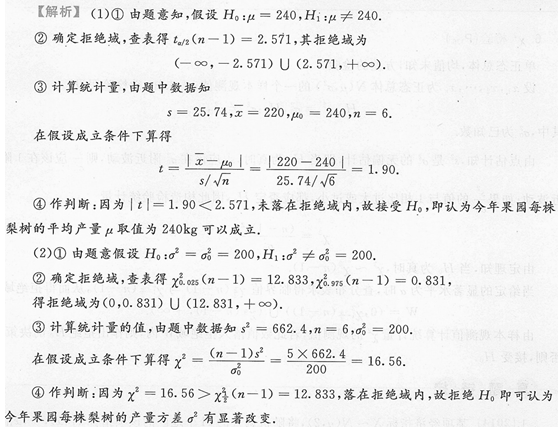 2),今年雨量有些偏少,在收获季节从果园一片梨树林中随机抽取6株,测算其平均产量为220kg,产量方差为662. 4kg,试在检验水平ɑ=0.05下,检验(1)今年果园每株梨树的平均产量μ的取值为240kg能否成立;(2)若设X~N(240,200),能否认为今年果园每株梨树的产量的方差万σ