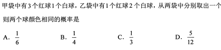 作者:高老师 时间:2024-08-03 浏览 0 A、AB、BC、CD、D【正确答案】:D【题目解析】:甲:红球为3/4,白球为1/4乙:红球为1/3,白球为2/3当两个球颜色为一样时,即为3/4 *1/3 +2/3 * 1/4=5/12 📱 扫码体验刷题小程序 扫一扫使用我们的微信小程序