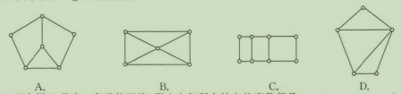 【题目解析】:本题主要考查的知识点为图的一笔画。A选项中,有4个结点的度数为3,故A中不存在欧拉路和欧拉回路;B项中,有4个结点的度数为3,故B中不存在欧拉路和欧拉回路;C项中,有4个结点的度数为3,故C中不存在欧拉路和欧拉回路;D项中,只有2个结点的度数为3,其余结点的度数均为偶数,故D中存在一条欧拉路,因此排除A、B、C项,选D。