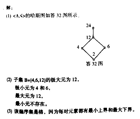 设A={2,4,6,12,24}, 作者:高老师 时间:2024-08-03 浏览 2 设A={2,4,6,12,24},<为整除关系,回答下列问题:(1)画出< A,<>的哈斯图;(2)求子集B={4,6,12}的极大元,极小元,最大元,最小元;(3)判断该偏序集是否为格。【正确答案】: 📱 扫码体验刷题小程序 扫一扫使用我们的微信小程序