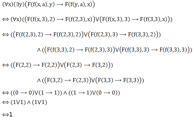 设解释I如下: D = {2 ,3} ,a =3,F(2 ,2) =F(3 ,3) =0 ,F(2 ,3) =F(3 ,2) =1, f( 2 ,2) =f( 2 ,3) =2 , f (3 ,2) =f( 3 ,3) =3。 求谓词公式