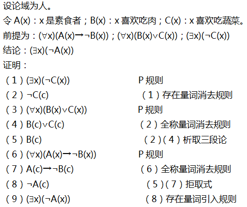 符号化下列命题,并构造推理证明。任何人如果他是素食者,他就不喜欢吃肉;每一个人或者喜欢吃肉或者喜欢吃蔬菜;有的人不爱吃蔬菜。因而 作者:高老师 时间:2024-08-03 浏览 0 符号化下列命题,并构造推理证明。任何人如果他是素食者,他就不喜欢吃肉;每一个人或者喜欢吃肉或者喜欢吃蔬菜;有的人不爱吃蔬菜。因而不是所有的人都是素食者。【正确答案】:【题目解析】:在符号化并证明推理有效性的题目中,要特别注意以下几点:(1)是命题逻辑的推理有效性还是谓词逻辑中的推理有效性问题;(2)如有必要,假设合理的论域;(3)用适当的符号表示所有的原子命题;(4)写出推理的假设和结论;(5)证明推理的有效性。特别注意的是量词消去的次序不能有误! 📱 扫码体验刷题小程序 扫一扫使用我们的微信小程序
