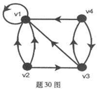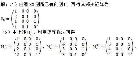 30.有向图D如题30图所示,回答以下问题: (1)写出D的邻接矩阵A; (2)D中长度为2、3、4的通路各有多少条?其中回路分别为多少条?