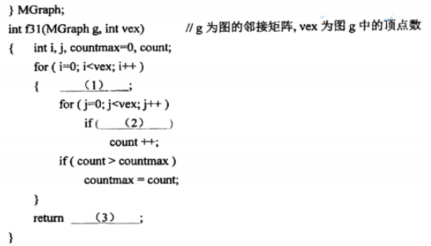 已知图的邻接矩阵表示的存储结构定义如下,算法f31()统计图中各顶点的度,并返回最大度数。请在空白处填上适当内容将算法补充完整。 作者:高老师 时间:2024-08-04 浏览 2 已知图的邻接矩阵表示的存储结构定义如下,算法f31()统计图中各顶点的度,并返回最大度数。请在空白处填上适当内容将算法补充完整。【正确答案】: 📱 扫码体验刷题小程序 扫一扫使用我们的微信小程序