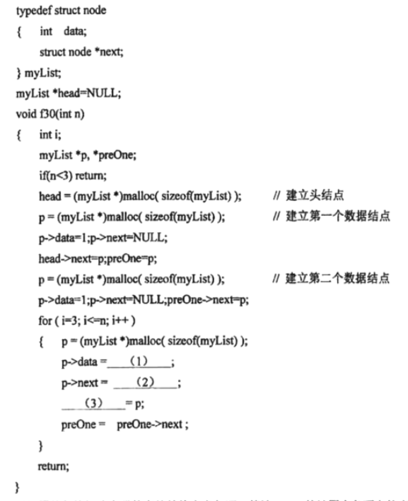 程序f30()创建了一个带头结点的含n(n≥3)个数据结点的单链表L,L前两个数据结点中的data值均为1,从第3个结点开始,结点的data值是其前两个结点data值之和。请在空白处填上适当内容将算法补充完整。