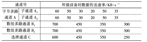 通道型I/O系统由一个字节多路通道A(其中包括两个子通道A1和A2)、两个数组多路通道B1和B2及一个选择通道C构成,各通道所接设备和设备的数据传送速率如表所示。