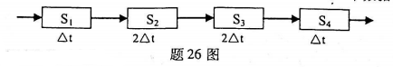 有一条4段(S1~S4)组成的数据处理流水线如题26图所示。其中,S1与S4的执行时间均为△t,S2与S3的执行时间均为2△t。该流水线连续处理5个数据,要求: