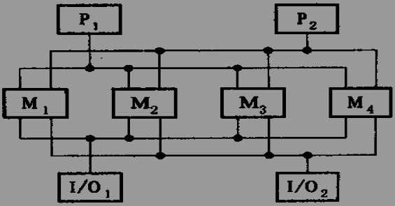 3)交叉开关:用纵横开关阵列将存储器模块、I/O通道相连。不争用开关;但开关阵列复杂,设备量较大。适合处理机数较多(但不超过16)、系统流量大、处理机数可扩充的情况。