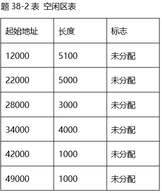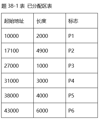 假设系统在时刻10:00的已分配区表如题38-1表所示,空闲区表如题38-2表所示。