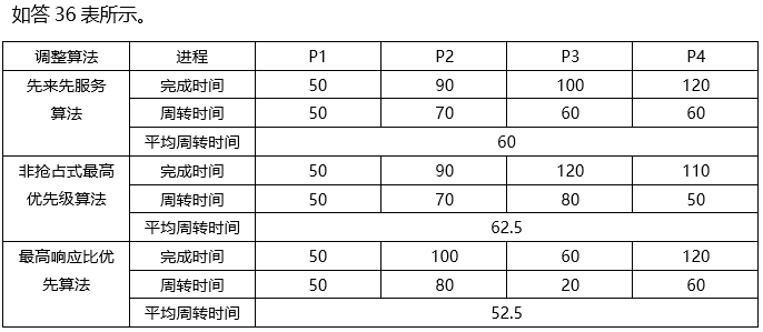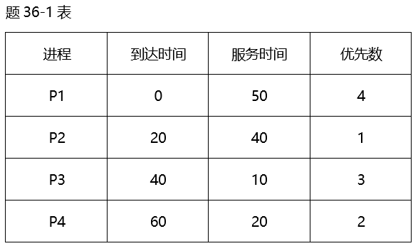有4个进程P1、P2、P3、P4,它们的到达时间、服务时间和优先数如题36-1表所示。忽略I/O以及其它开销时间。若分别采用先来先服务算法、非抢占式最高优先级算法(优先数小的进程优先级高)、最高响应比优先算法,计算各进程的完成时间、周转时间和平均周转时间,按题36-2表的格式在答题卡上填写(计算结果四舍五入,保留一位小数)。