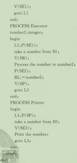 本题也可看做是两个生产者/消费者问题。Reader进程为生产者,Executor进程既是消费者又是生产者,Printer进程为消费者,由于这里有两个缓冲区,所以要设四个信号量:SR表示是否能把数据存人缓冲区B1,初值为1;SE1表示缓冲区B1中是否已存有数据可供处理,初值为0:SE2表示是否把处理过的数据存入缓冲区B2,初值为1;SP表示缓冲区B2中是否已有数据可供打印,初值为0。