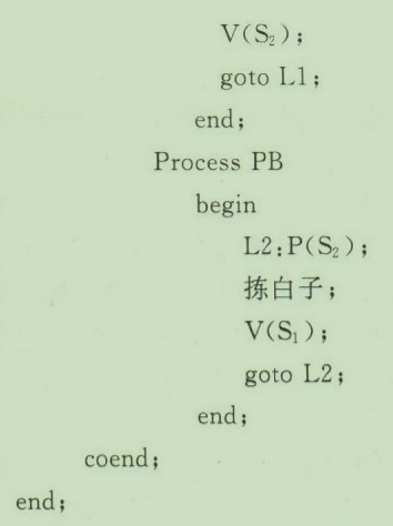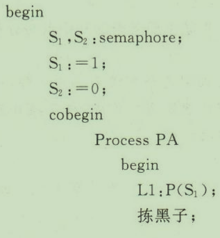 (2)在该问题中,应该区分“允许拣黑子”和“允许拣白子”两个消息,所以应该定义两个信号量S₁和S₂,分别和两个消息相对应,初值是S₁:=1;S₂:=0或者S₁:=0;S₂=1。