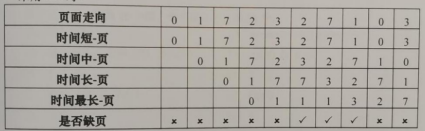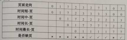 (注:LRU算法中,“时间最长-页”表示未使用时间最长的页面,“时间长-页”其次,“时间短-页”表示未使用时间最短的页面。“是否缺页”行中,要求用×表示缺页,√表示不缺页)