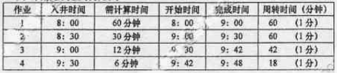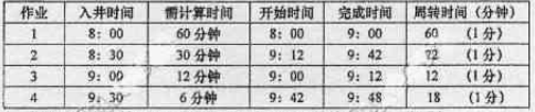 38.在一个单道批处理系统中,有4个作业进入系统,进入输入井的时间及需计算时间如下面的表格所示。现忽略系统开销的时间,并规定8:00时当第一个作业进人输入井立即开始作业调度。 (1)当采用先来先服务调度算法时,将各作业的开始时间,完成时间,周转时间填入下面表格的相应位置中。