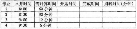 (2)当采用计算时间短的作业优先调度算法时,先将各作业的开始时间,完成时间,周转时间填入下面表格的相应位置中,再计算4个作业的平均周转时间,写在表格下面的空白行处。
