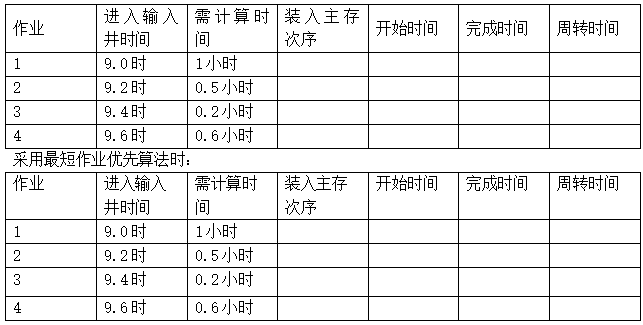 在一个多道批处理系统中,有如下所示的作业序列。假定四个作业进入输入井后立即开始调度,并且作业都是仅作计算的,同时忽略系统开销的时间。请通过填表分别算出采用先来先服务和最短作业优先算法时的作业调度次序和作业平均周转时间。采用先来先服务算法时: