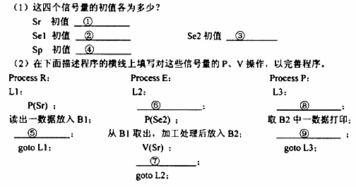 假定缓冲器B1和B2只能分别存放一个数据,要求进程P打印出来的数据与进程R读出数据的个数和顺序一致,应该设置四个信号量Sr.Se1.Se2 和Sp。请问: