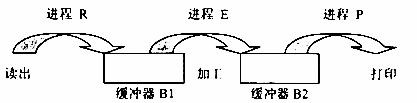 有三个进程R、E和P协同工作。R进程专门从某输入机上读出数据并放入缓冲器B1:E进程将B1中数据取出,加工处理后放入缓冲器B2;P进程从缓冲器B2取出数据打印。如图: