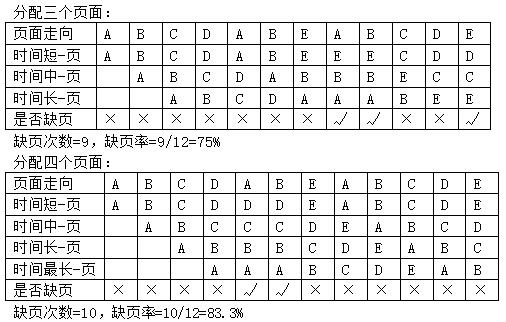 某程序在内存分别分配三个和四个页面,初始为空,所需页面的走向为A、B、C、D、A、B、E、A、B、C、D、E,采用先进先出页面置换算法(FIFO)。