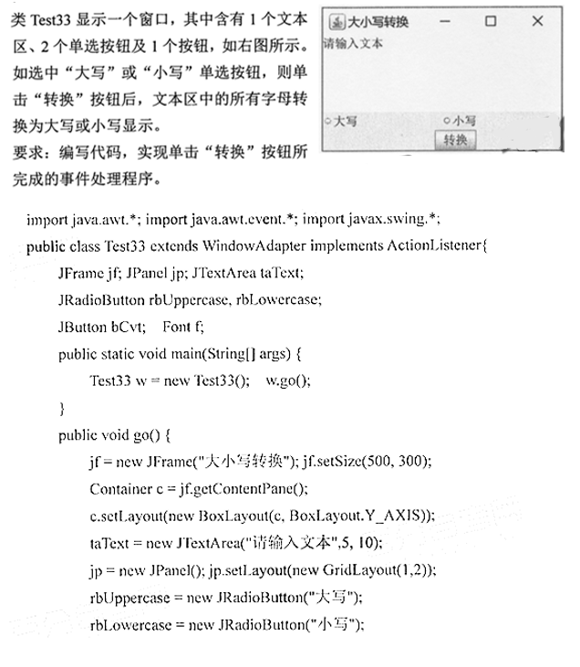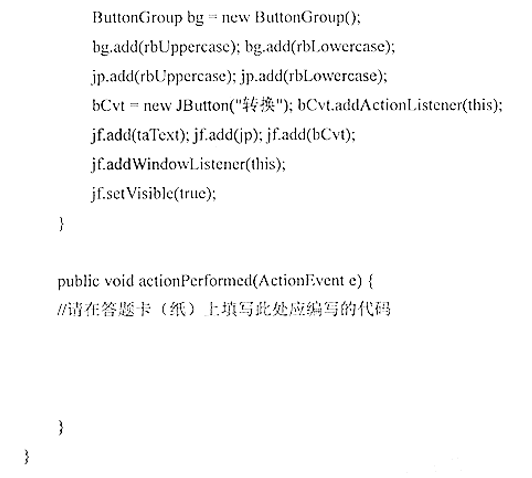作者:高老师 时间:2024-08-04 浏览 1 【正确答案】:if(e.getSource() == bCvt) { String t = taText.getText(); if(rbUppercase.isSelected()) taText.setText(t.toUpperCase()); else if(rbLowercase.isSelected()) taText.setText(t.toLowerCase()); } 📱 扫码体验刷题小程序 扫一扫使用我们的微信小程序