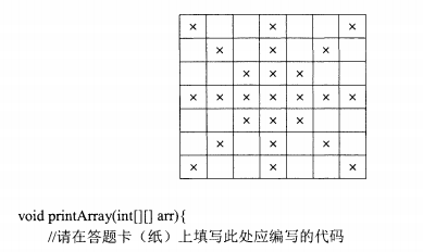 设有大于3的奇整数n。请编写方法void printArray(int[][]arr),该方法的功能是在屏幕上输出n行n列数组arr中特殊位置的数据。以7行7列的方阵为例,标注“x”的即是这些特殊位置。输出的元素次序任意,但不允许有重复。