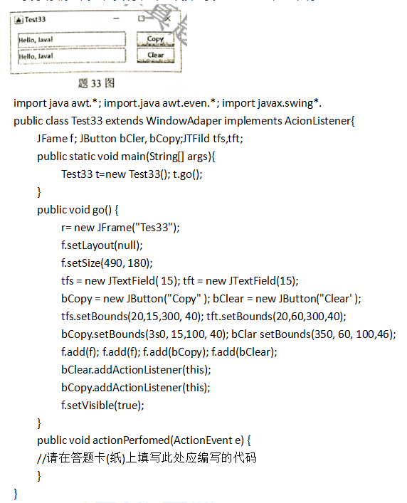 类Test33构造了2个文本域及2个按钮,如题33图所示。其中,“Copy”按钮的功能是将文本域tfs中的内容复制到文本域tft 作者:高老师 时间:2024-08-04 浏览 2 类Test33构造了2个文本域及2个按钮,如题33图所示。其中,“Copy”按钮的功能是将文本域tfs中的内容复制到文本域tft中,“Clear”按钮的功能是清空两个文本域。注:要求你编写代码,实现单击两个按钮要完成的事件处理程序。 类Test33构造了2个文本域及2个按钮,如题33图所示。其中,“Copy”按钮的功能是将文本域tfs中的内容复制到文本域tft中,“Clear”按钮的功能是清空两个文本域。 注:要求你编写代码,实现单击两个按钮要完成的事件处理程序。【正确答案】: 📱 扫码体验刷题小程序 扫一扫使用我们的微信小程序