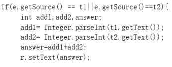 某应用程序的界面如下图所示,有3个文本框,第一个文本框对象为t1,第二个文本框对象为t2,第三个文本框对象为r。程序对前两个文本框作事件监视。程序运行时,当前两个文本框有整数输入时,在第三个文本框输出它们的和。要求编写实现上述功能的方法actionPerformed(ActionEvent e)。