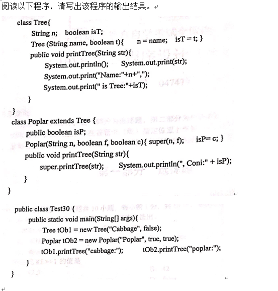 阅读以下程序,请写出该程序的输出结果。 作者:高老师 时间:2024-08-04 浏览 0 阅读以下程序,请写出该程序的输出结果。【正确答案】:cabbage:Name:Cabbage,is Tree:falsepoplar:Name:Poplar,is Tree:true,Coni:true 📱 扫码体验刷题小程序 扫一扫使用我们的微信小程序