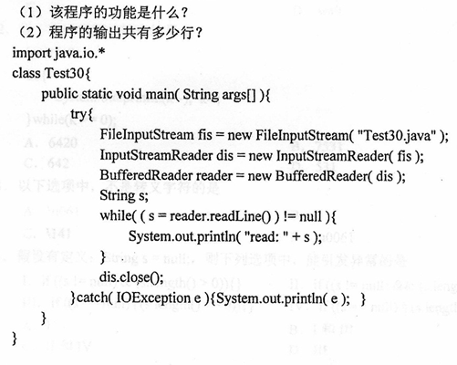阅读下列程序,请回答以下问题。 (1)该程序的功能是什么? (2)程序的输出共有多少行? 作者:高老师 时间:2024-08-04 浏览 0 阅读下列程序,请回答以下问题。 (1)该程序的功能是什么? (2)程序的输出共有多少行?【正确答案】:解释:1. 共输出15行。2. 代码第一行漏了分号 import java.io.*; 3.如果是在Eclipse上运行的代码,第5行修改为 FileInputStream fis = new FileInputStream( "./src/Test30.java"); 当然如果用命令行来编译的话就不用修改。 📱 扫码体验刷题小程序 扫一扫使用我们的微信小程序