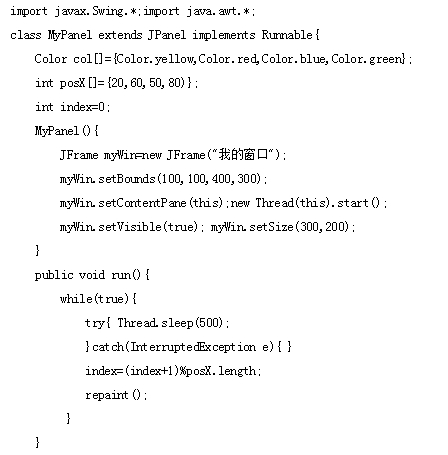 阅读下列程序,请回答以下问题: (1)MyPanel用什么方法实现多线程? (2)程序如何实现显示内容不断变化的? 作者:高老师 时间:2024-08-04 浏览 0 阅读下列程序,请回答以下问题: (1)MyPanel用什么方法实现多线程? (2)程序如何实现显示内容不断变化的?【正确答案】:(1)用 Runnable接口实现多线程。(2)由线程循环更改显示的颜色、位置实现动态效果。 📱 扫码体验刷题小程序 扫一扫使用我们的微信小程序