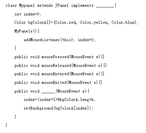 面板子类MyPanel实现在面板监视鼠标单击事件,当鼠标在面板上单击时,面板的背景色就会循环改变。以下是类MyPanel的定义。