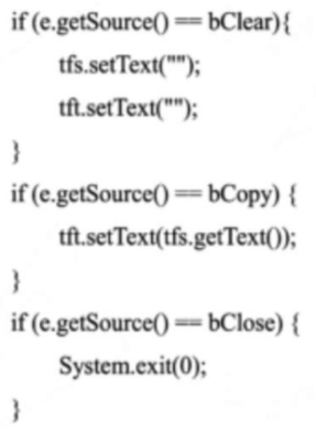 类Test33显示一个窗口,其中含有两个标签、两个文本框及三个按钮。如题33图所示。单击Clear按钮时清空两个文本框的内容;单击Copy按钮时将上面文本框的内容复制到下面的文本框中;单击Close按钮则结束程序的运行。