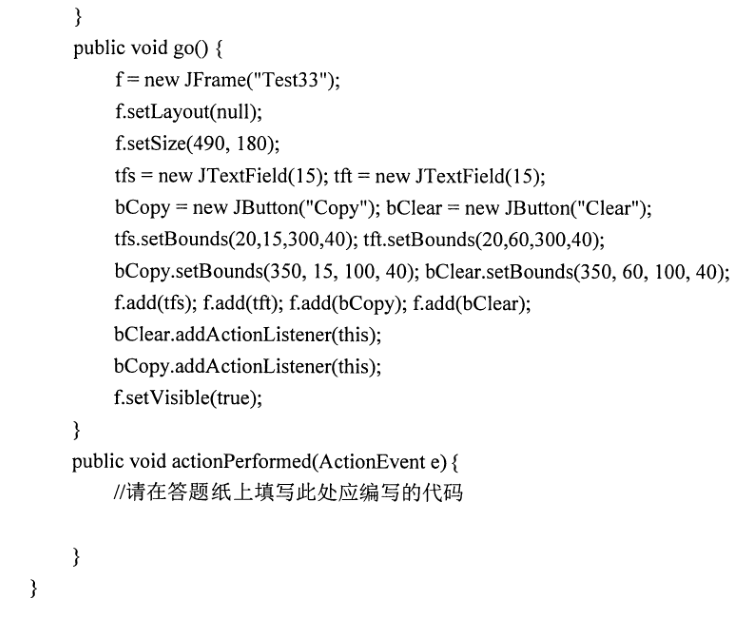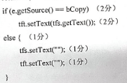 类Test33构造了2个文本域及2个按钮,如est3口题33图所示。其中,“Copy”按钮的功能是将文本域tfs中的内容复制到文本域tft中,“Clear”按钮的功能是清空两个文本域。注:要求你编写代码,实现单击两个按钮要完成的事件处理程序。